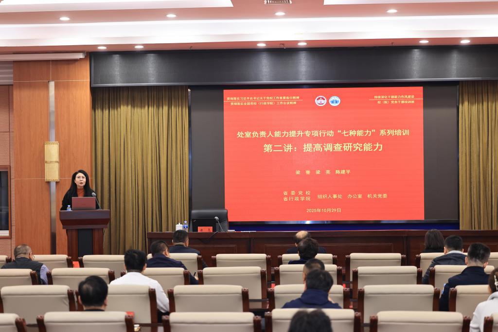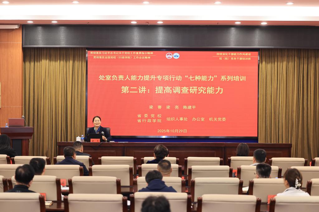 为深入学习贯彻习近平总书记关于党校工作的重要论述、重要指示精神和全国党校(行政学院)工作会议精神,持续深化干部能力作风建设,提升党员干部履职能力,10月29日,校(院)以“学理论·强党性·转作风·提能力”为主题,持续推进“处室负责人能力提升专项行动”,聚焦习近平总书记要求领导干部必须具备的“七种能力”开展系列专题培训。系列专题培训的第二讲以《提高调查研究能力》为主题,并同步作为年度校(院)党务干部培训班的开班第二讲。副处级以上党员干部及各支部党务工作者参加培训学习。