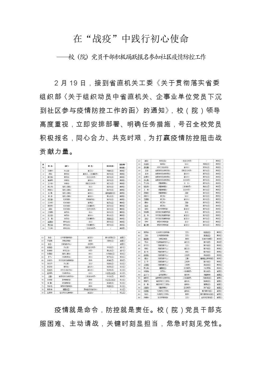 在“战疫”中践行初心使命——校(院)党员干部积极踊跃报名参加社区疫情防控工作