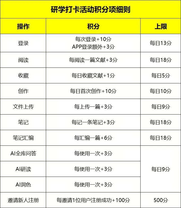参赛者登录研学平台(x.cnki.net)进行阅读、收藏、笔记、AI问答、AI研读等操作,即可领取相应学习积分(在Web端和APP端操作均可领取积分)。比赛结束后根据个人积分排名情况进行奖项评定。